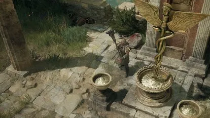 如果这是你首次访问废墟,场地中会有鱼和蝙蝠的混战。先清理战场,确保可以接近中央火坑附近的巨大碗状祭坛。在这里,将赫尔墨斯手杖放在祭坛上,相关任务将出现在你的任务日志中。